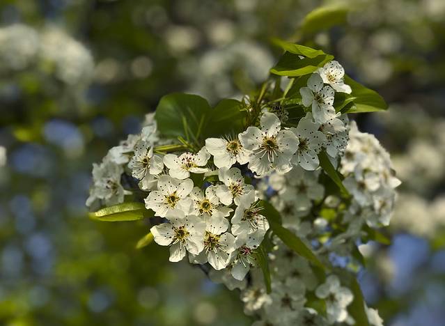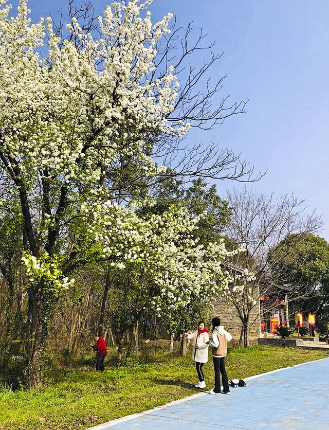 财神庙前一树高大的梨树花开正艳,引来游人驻足。