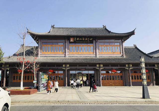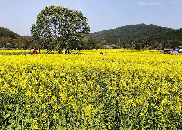 观光车经过一大片盛开的油菜花海后,停在了阳明书院前。今天是周日,景区人多热闹非凡,玩儿大秋千的高音喇叭强调了小城市热门景区的特色。