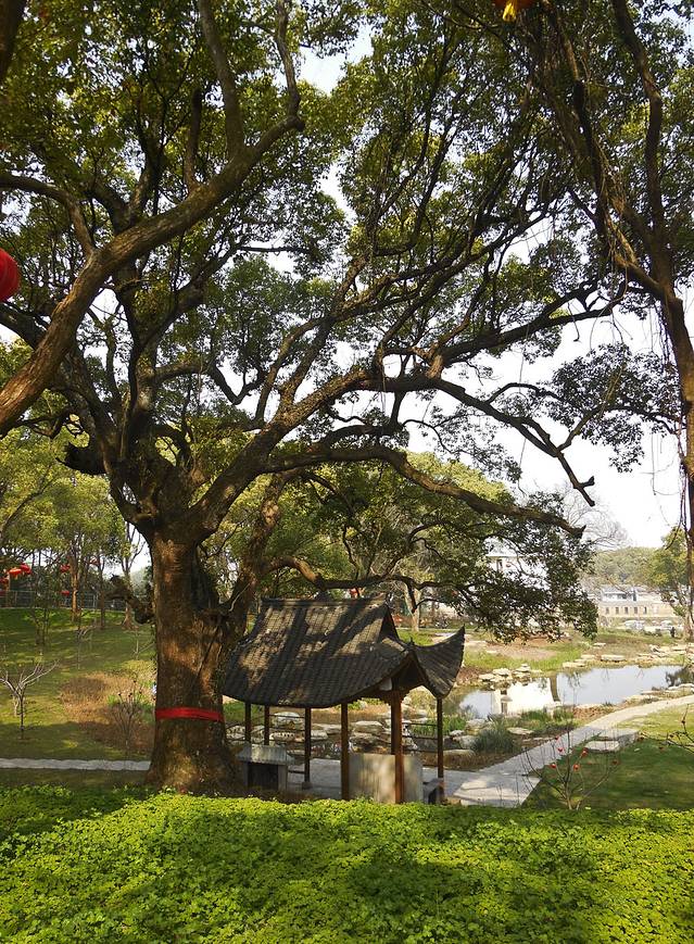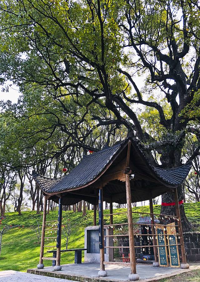 进村向左瞅见一大片古樟,绿荫成林,茂密葱茏。不由得信步过去,郁郁葱葱之间,见到坡下一个玲珑翘角凉亭,怡然立于一棵巨大樟树下。走过去发现这个那位欧阳腾之墓。