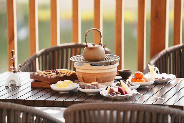 体验完香文化到全日制餐厅户外阳台喝下午茶,精美的点心,抬眼望去一片金黄的油菜花田,喝上一杯茶,吃着小点心,很是惬意。