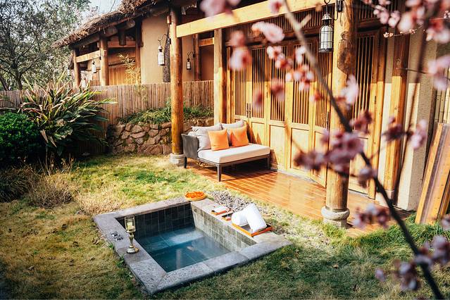 进入客房区域,茅草屋、夯土墙映入眼帘,管家介绍说客房设计是延续了安缦御用设计师JAYA先生的设计风格,融入本地文化,传承川西民居建筑风格,进入房间80平方米起的房型,中式的古典配有豪华床上用品和现代化的设施,还有管家贴心准备的小熊猫,推开门独立的庭院配备私人独享泡池,疲惫的身心一下子就放松下来了。