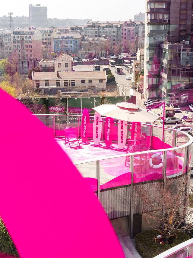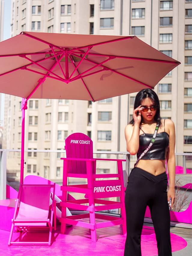 粉色沙滩垫配上休息椅“、各具特色的粉色摊位、一切都太少女啦~整个人置身于梦幻般的粉色世界,万象汇这个美陈装置📷怎么拍都好看