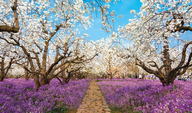 尝过鲜花开在舌尖的烂漫,到三台山国家森林公园,徜徉花间,感受梦幻梨兰会。当500亩梨花与万株二月兰同时绽放,形成“梨兰会”独特的盛世景观。仰头,一树树梨花,在林间的鸟语清风中,洁净优雅,一树树梨花开出的白,像是给林间镀上一层月色。俯首,一片片二月兰,在林间的暖阳下,朦胧隐约,满眼的紫,像是给大地铺上了一张地毯。此情此景,站在林间,清风徐徐,花香怡人。