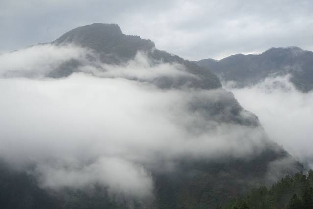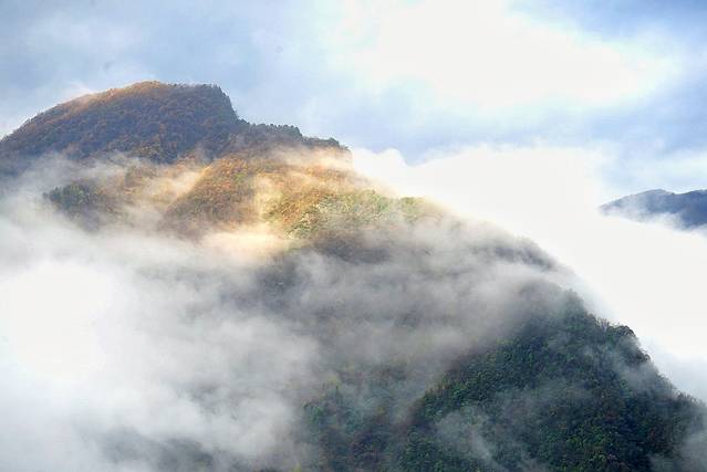 早餐前,在民宿亭台拍摄云雾,“一片”阳光飘过,瞬间冲散了经过的云雾,光耀洒在山间,如天光乍现般,可不就是日照金山么?!可惜,阳光只有那一瞬间,但美好已经记录在脑子里,跃现于图片中。