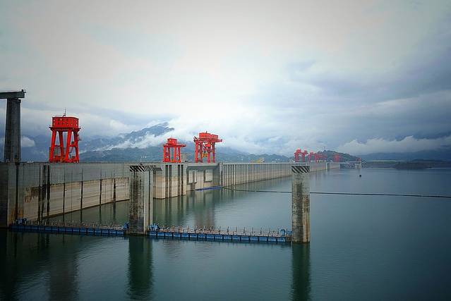 三峡大坝185平台,黄色与灰色中间线为最高蓄水线,约174米。