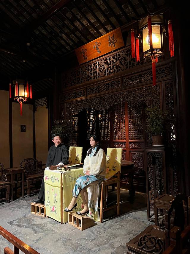 节目间隙领队在说着古时大户人家的夜生活等等。同组游客讨论着,他们的夜景很美。这时另一人搭话,那时可没这么强的光照~