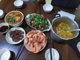 早晨抵达南宁站后,因为我们要先到防城港,只有到南宁东火车站乘坐动车。出火车站的大门旁就是轻轨站,直接乘坐轻轨1号线到南宁东火车站(票价4元)A口出站,购买11:36的动车到防城港北(票价51.50元),到防城港北的时间是12:29分,中午就在动车上吃的面包;出了动车站的大门,右边就是汽车站,非常方便,那里就停着到东兴的大巴车(票价18元)。现在到东兴的路修的非常好了,大概1个小时左右就到了东兴汽车站。我们5个人,在网上订的民宿,3室2厅2卫,每天196元,可以自己买海鲜回来加工。放下行李后,就去向当地人打听了卖海鲜最便宜的市场,导航直接东兴国贸市场就行了。