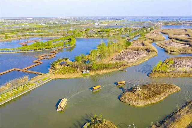 赏过名胜古迹的匠心独运,也别错过自然景致的巧夺天工。洪泽湖湿地景区内,“暖雨晴风初破冻,柳眼梅腮,已觉春心动”。绿林和湖水,赋予了洪泽湖湿地以韵味,当清晨的朝霞照亮树林,而树林,随着阳光一闪,金光和绿色交织,晕染出春林的氤氲。芦苇繁密,让洪泽湖湿地景区变做“芦苇迷宫”,划船探秘,最是有趣。