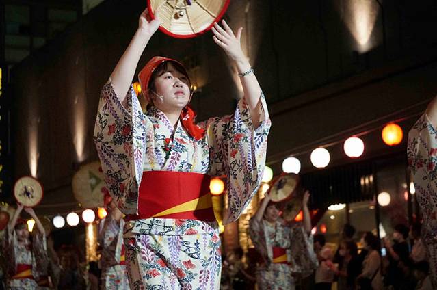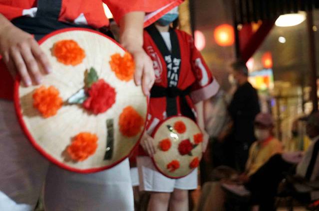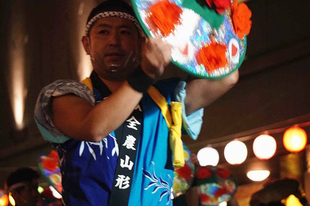 花笠舞顾名思义就是手持山形特色的“花笠”边游行边舞。舞蹈形式、花笠样式和服装的设计上,每个方队(大多是山形的一些公司、社会组织)都有自己的特色,也是这个节日的一大看点。