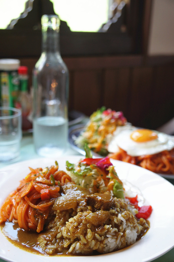 最后,我们找了一家昭和氛围感的咖啡店,吃了日式的西餐。这家店可以双拼,如果咖喱意面都想吃,还可以尝试下这种碰撞组合呢。