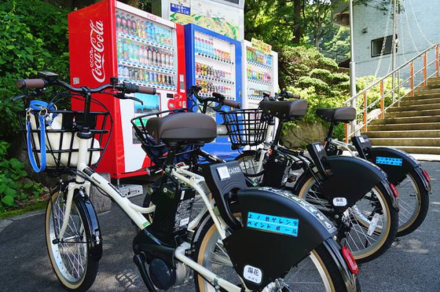 下来巴士就可以看到藏王山麓站了,从这里可以乘坐缆车,也可以去藏王温泉街逛一逛。温泉街还是比较大的,如果有日本的APP系统和支付方式,可以租借这种共享单车。一个小时300日元。