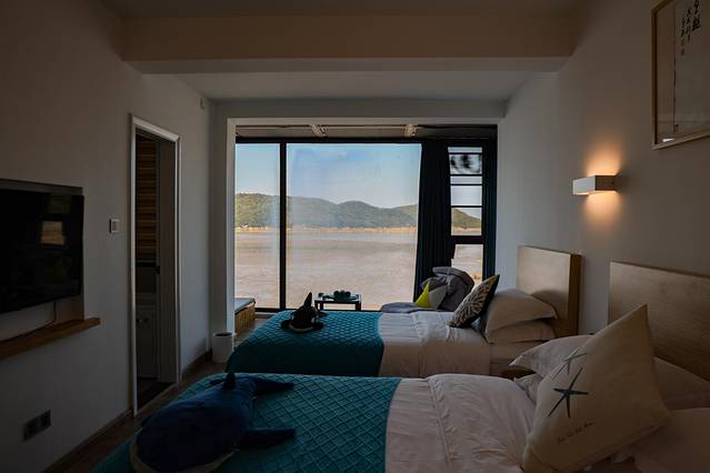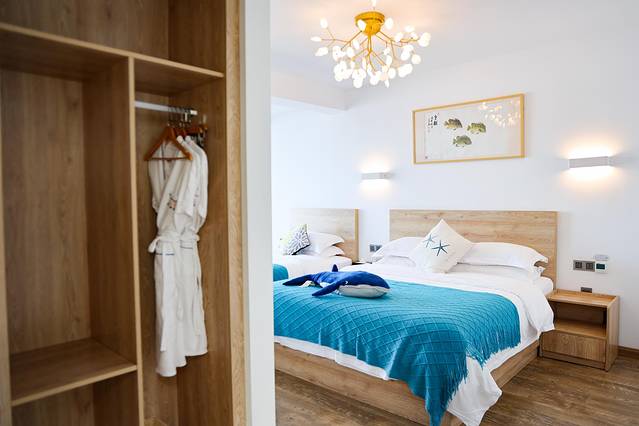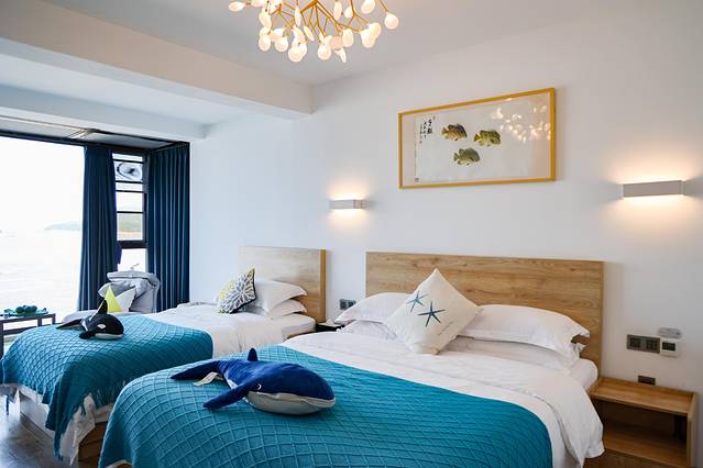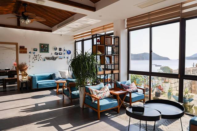 窗外,就是180度无敌海景,大海近在咫尺,触手可及,晚上枕着涛声入眠,清晨,拉开窗帘就能醒日出,远离都市喧嚣,感受海风扑面而来,仿佛自己也融入到这一刻的山海之中。