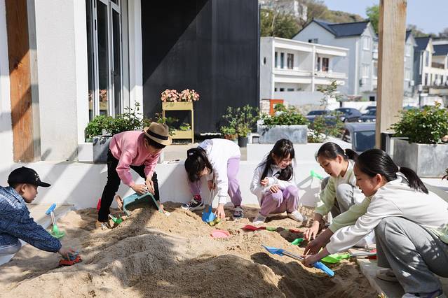 站在孩子的角度,自然最爱一楼户外的泳池,可惜目前还没到开放的时间,一楼还有个小的挖沙池,元宝特别喜欢,和当天入住的小朋友打成一片,在挖沙池玩了很久。