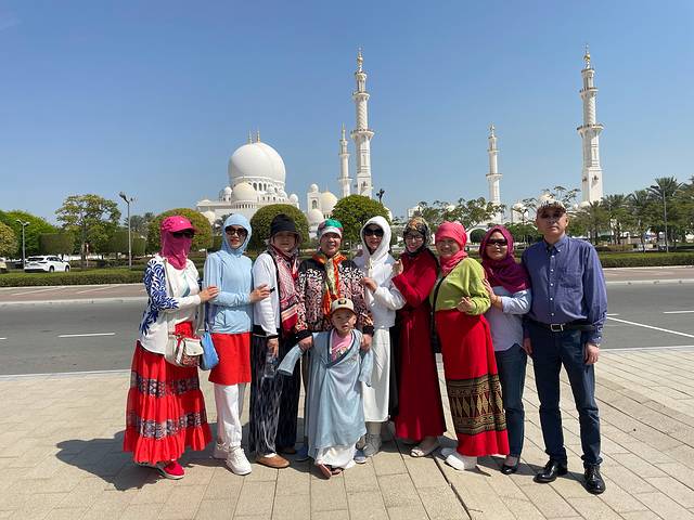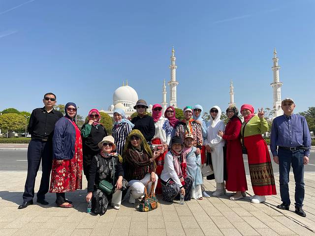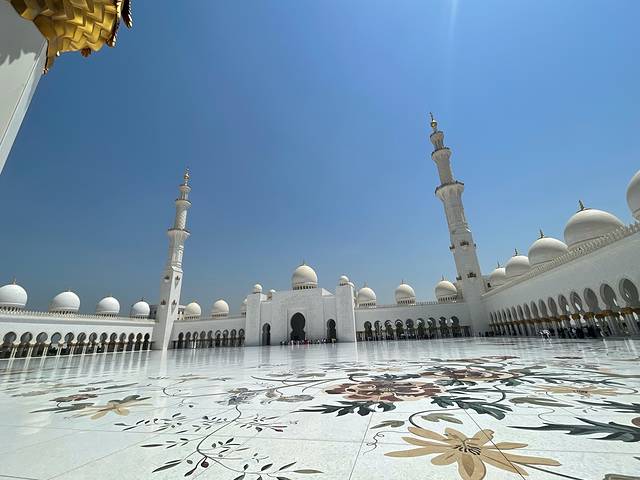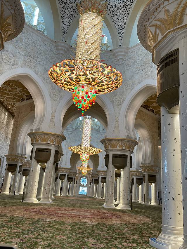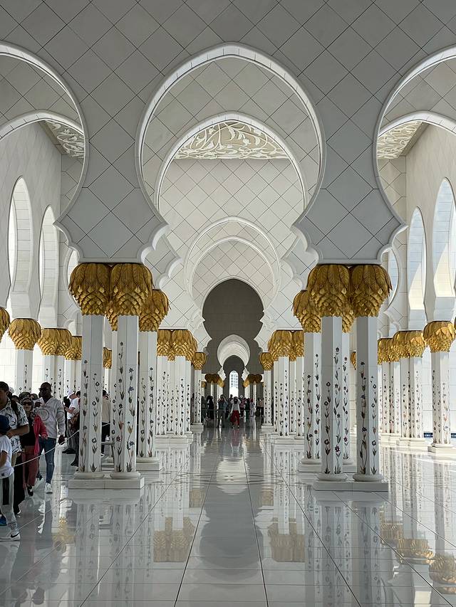 谢赫扎伊德清真寺是是阿联酋最大的清真寺,在穆斯林世界是第二大的,耗资55亿美元,历时13年的谢赫阿布扎比大清真寺是为了纪念1972年建立阿联酋后的第一任总统谢赫阿布扎比而建的。柱子上的耶叶是黄金包裹的,柱子上的花纹是大理石镶嵌的,不是绘画的哟!
