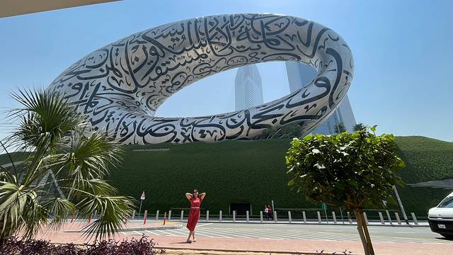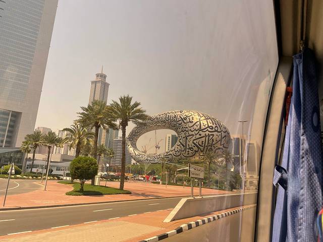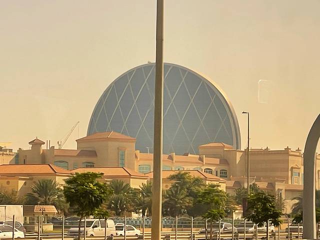 从阿布扎比回迪拜的途中车观国会大厦,正面像月饼