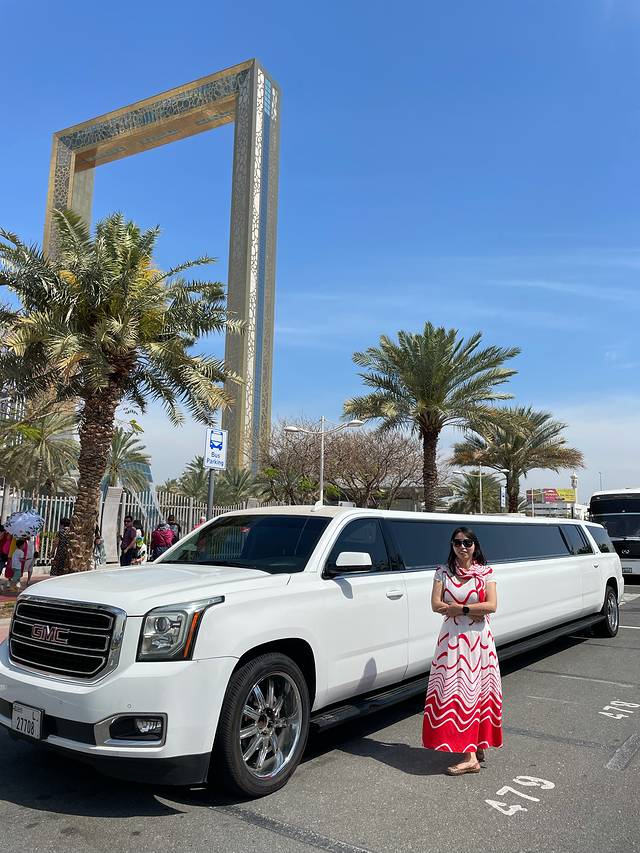 GMC美国商务豪车,50-200多万,车旁边就是迪拜金相框,外面是镀金的,两边是电梯,50层高,花了3亿人民币,上面是博物馆