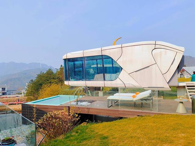 整个民宿位于清凉寨度假酒店旁边的悬崖上,只见空地上错落着好几座白色的太空舱,显得科技感十足。