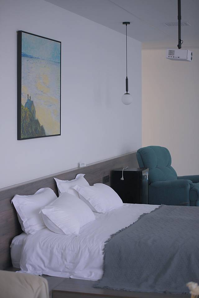 值得一提的是,民宿的细节很到位,比如说每间客房内都带有投影仪噢。这个功能很实用,比方说约上心爱的伴侣来这里享受度假氛围,静静地在室内用投影仪观影,太棒了。