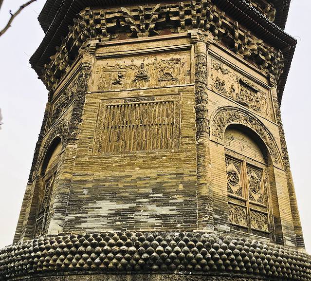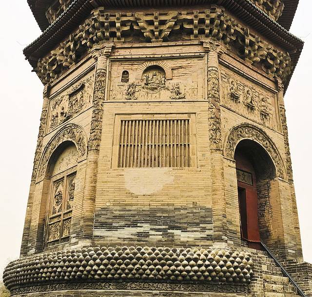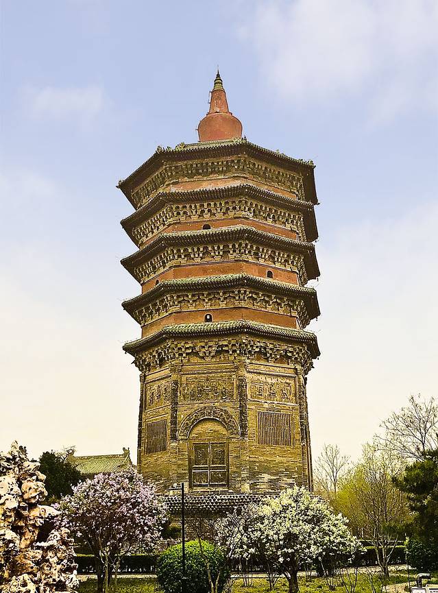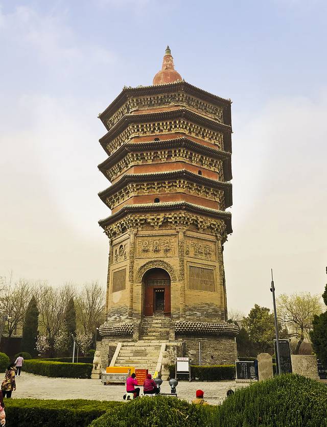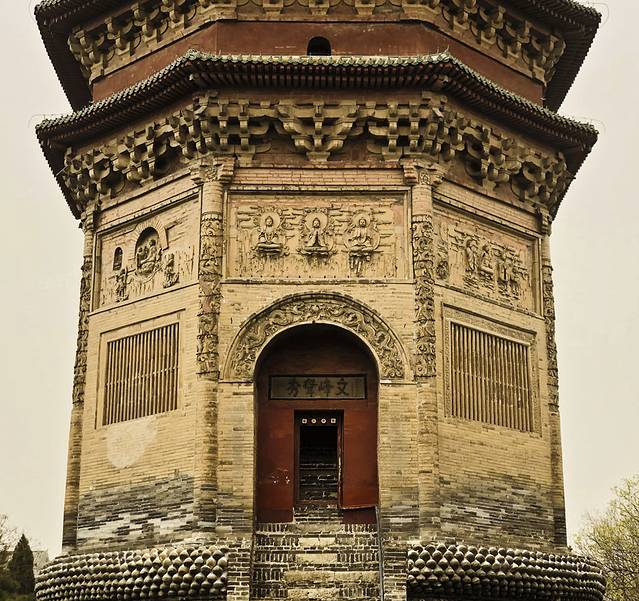 文峰塔建于五代后周广顺二年,已有1000余年历史,全国重点文物保护单位。 文峰塔五层八面。浮屠五级上有平台,下有券门,每层周围有小园窗。塔坐落在一个高达二公尺的砖砌台基上。这种平台、莲座、辽式塔身、藏式塔刹的形制世所罕见。塔的八面壁上分别饰有直棂窗、园券门和佛画故事砖雕,其刻工细致,形象逼真,造型动人。