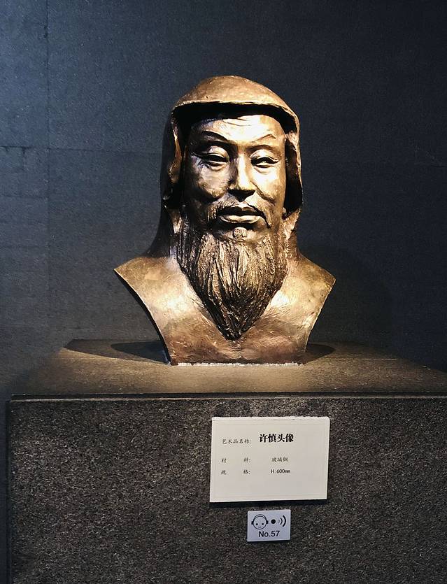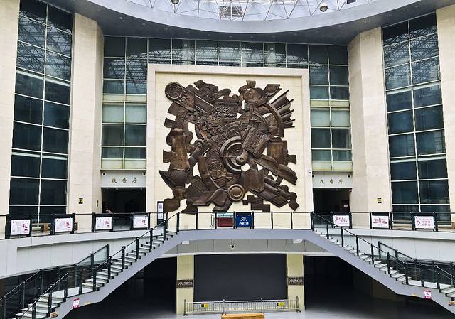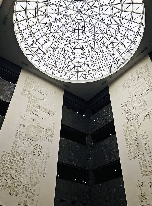一楼大厅高大明亮,白色的四条高柱上布满了浮雕,我的视线被引到圆形白色穹顶上,非常特别的设计 。这里就属于博物馆的序厅,整体设计隐含了传统文化中天圆地方的理念,序厅四周的四面浮雕分别展示了中国文字载体发展史、中国书法发展史等概况。