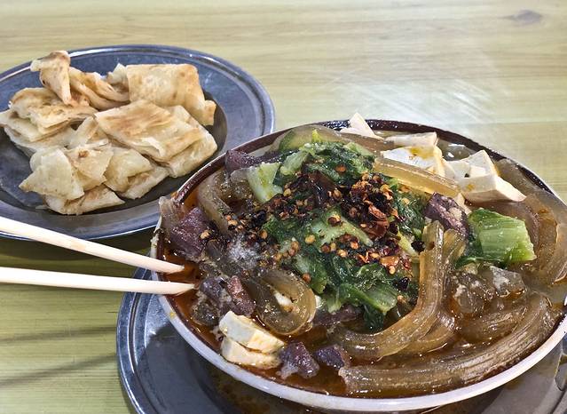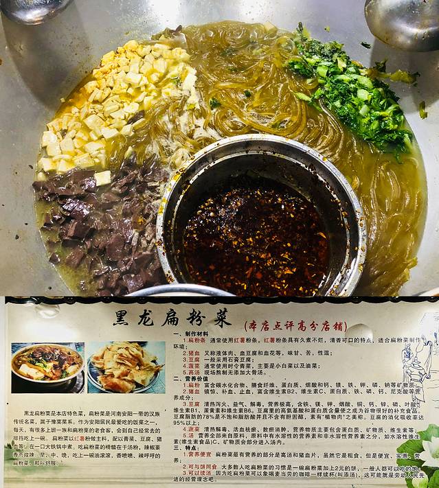 安顿好休息会儿,近12:00出来,美团上找了个什么鱼的饭馆,就在酒店后面小街上,这是条小小的美食街,一连几家小饭馆。可到了一看关门了。便过马路去对面吃安阳我知道的唯一特色美食“扁粉菜”。这是一家专门经营扁粉菜的老店,8元钱一大碗,配一份饼,还有免费豆浆,真是物美价廉。“扁粉菜”是用宽粉条、猪血、豆腐青菜顿在一起的,各样装在大碗里,洒上辣椒油蒜汁,味道很好,比较适合我这个北方人口味。