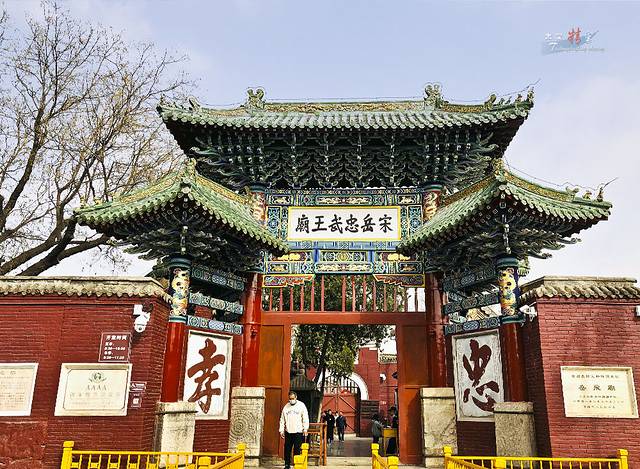 岳飞庙庙门-精忠坊,重桅高翅,斗拱繁复,非常气派,是明制式木结构牌楼,顶覆斗拱型九踩四昂重翘;坊正中阳镌明孝宗朱祐樘赐额“宋岳忠武王庙”,两侧八字墙上用青石碣分别阳刻“忠”“孝”两个