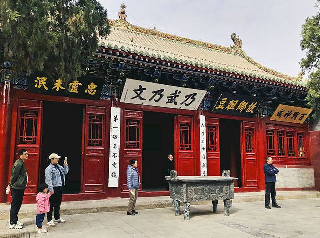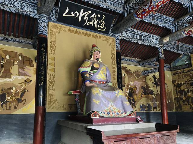 穿过山门、御碑亭、就是正殿-岳王殿,面阔五间,进深三间,为五踩重翘重昂型制斗拱硬山式建筑,殿门上悬有五块巨匾,分别是“乃武乃文”“故乡俎豆”“忠灵示泯”“百战精威”“乾坤正气”;殿中央为岳飞英武魁伟的彩塑坐像,殿内悬“还我河山”贴金巨匾。