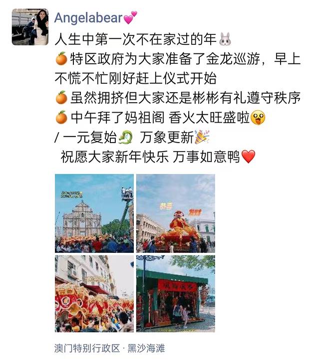 巨长的舞龙队伍向大家热情地问候新年好,还有“财神爷”为大家送祝福,一元复始,万象更新,每个人脸上都是喜悦,都是快乐,这样的过年氛围还是第一次体验,强烈推荐大家到澳门过年!