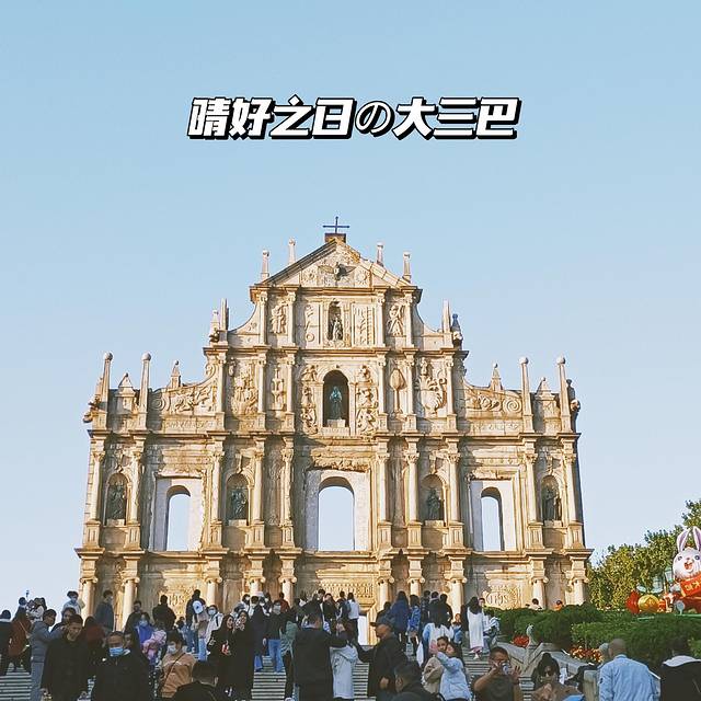 大三巴牌坊,前身为保禄大教堂,始建于明万历三十年(1602年),于清道光十五年(1835年)1月26日被大火焚毁,仅余下大三巴牌坊。大三巴牌坊的雕刻和镶嵌较为精细,融合了东西方建筑艺术的精华,是一个中西文化交融的艺术品。2005年,大三巴牌坊与”澳门历史城区“的其他21栋建筑物文物成为联合国世界文化遗产。 大三巴牌坊是澳门最富盛名的标志之一,也是每位游客必打卡之地。