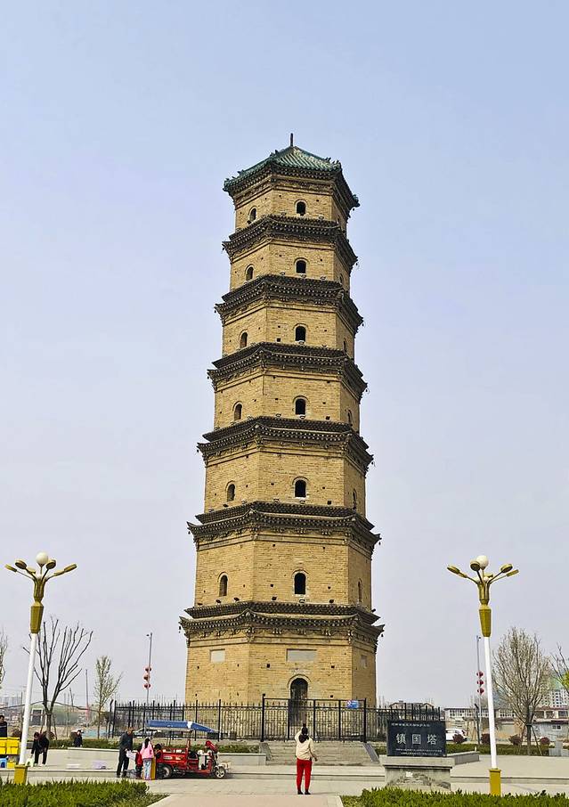 镇国塔在一个街心广场上,造型经典,可能是修缮得地方太多,旧物太少,没评上国家级,但周边