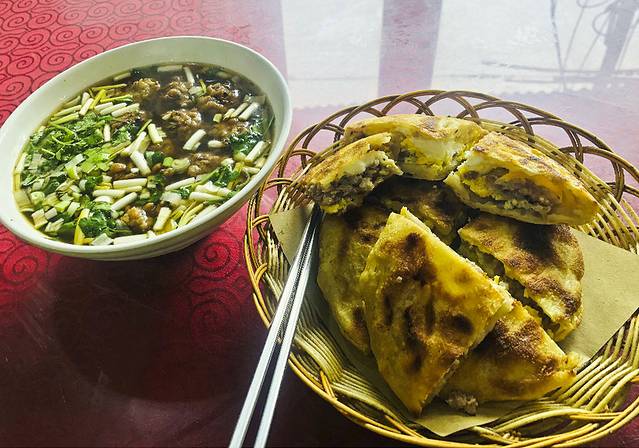 呀,这时有些累了,古城内基本游完了,下一步是出城游南边的浮丘山,有城隍庙,还有个国家级的碧霞宫。走过去1公里,叫了滴滴打车说古城这里过不来,就只好走着吧。其实也不远,就是已走了一上午了,肚子也饿了,想着得赶紧找吃的,否则浮丘山游完是大伾山就没有东西吃了,正想着就见到一种现饹的石仔饼,很好吃的样子,饭馆里面还有炒菜和汤。我要了2个饼加一碗豆面丸子汤,老板娘说这两样是绝配。饼和汤上来了,一看果然不错,意外发现饼里面还是满满的肉和鸡蛋馅儿的,非常好吃。汤也很好,是用豆面和萝卜丝炸成丸子再做成汤,两样就是当地特色。啊呀,太合我意啦!