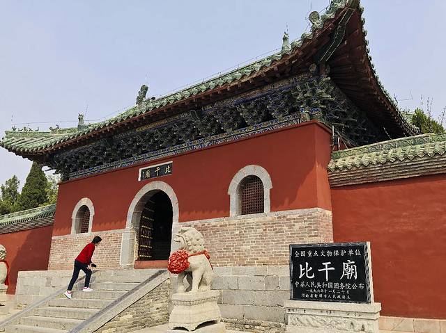 比干庙,是商朝忠臣比干的庙宇,庙墓合一建筑群,称为“天下第一庙”。 大家都知道比干的故事,是历史上以死谏君的忠臣,称为“天下第一仁”。周武王封比干为国神。北魏孝文帝因感念其忠心而建庙。现存留的建筑群为明代弘治7年重建。庙内保存着很多有着重要价值的文物古迹,其书法、雕刻、建筑风格都有很高的品位和历史价值。