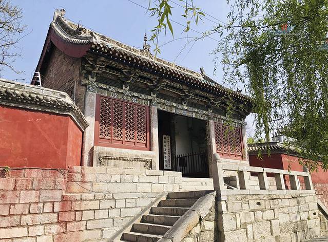 山门面阔3间,单檐歇山式建筑,绿色琉璃瓦顶。