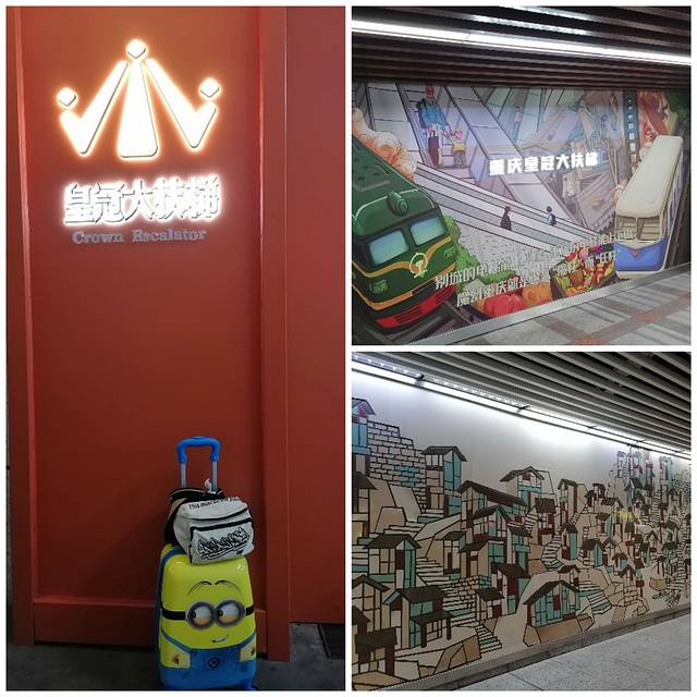 皇冠大扶梯,连接了两路口和重庆火车站,是亚洲第二长的一级提升坡地大扶梯,被称为中国攀山第一梯。全长112米、高52.5米、宽1.3米、坡度30度。