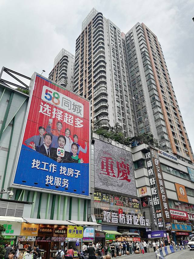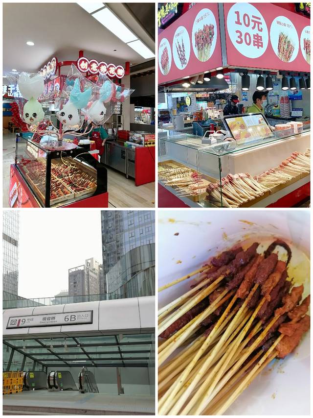 从观音桥出站,有个大喇叭循环播放:好吃街从商场进入,负一楼到达。