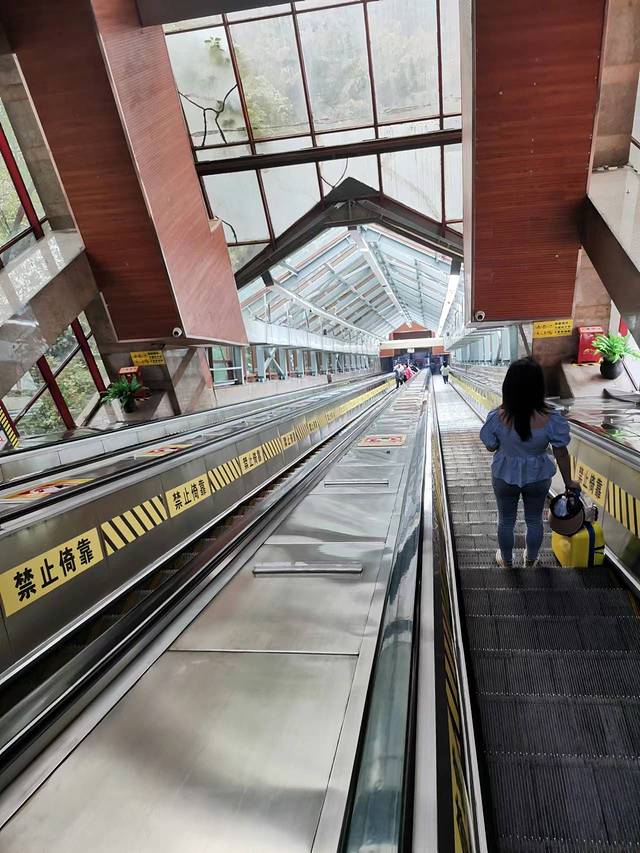 大扶梯全程监控,有人在扶梯上打卡忘记手扶行李,保安小哥哥拿着大喇叭提醒注意安全。