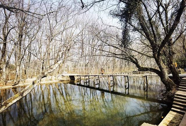 围绕着月沼慢慢走、慢慢看,突然一种熟悉的感觉涌上心头,眼前浮现出了李慕白与玉娇龙在打斗的场景:玉娇龙从屋顶一跃而下,蜻蜓点水,然后持剑飘然而去……,想起来了!这是李安的电影《卧虎藏龙》中的一个片段,原来这场景就是在月沼取景的,怪不得这么眼熟。