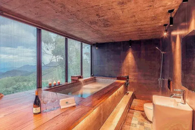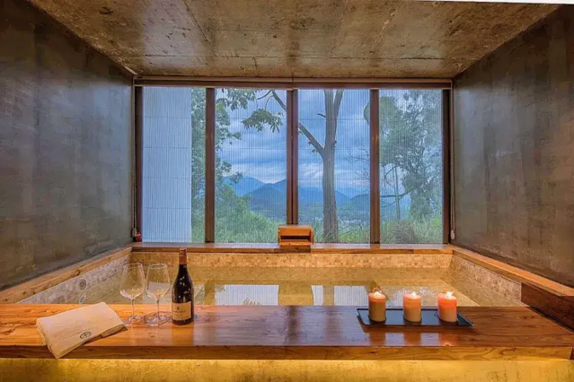 由牛棚改造而来的温泉房是民宿的亮点,木质的屋顶保留着原生态的味道,半开敞的汤池更像一座观景台,坐拥山水景观,泡一壶清茶或饮几杯香醇,都是极惬意的享受。