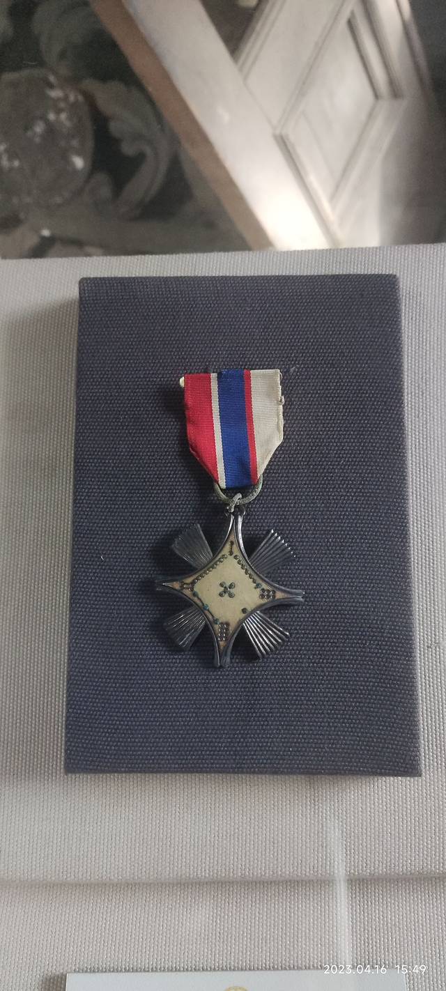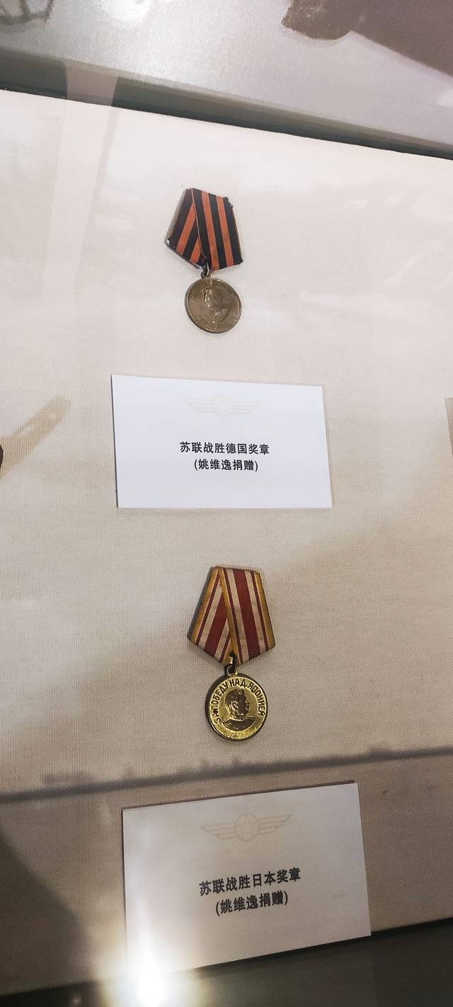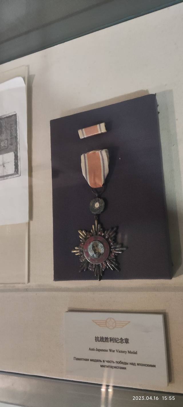 中国空军勋章和抗战胜利勋章,其中抗战胜利勋章共有8个角象征受勋人历经8年抗战,中间是委员长头像。