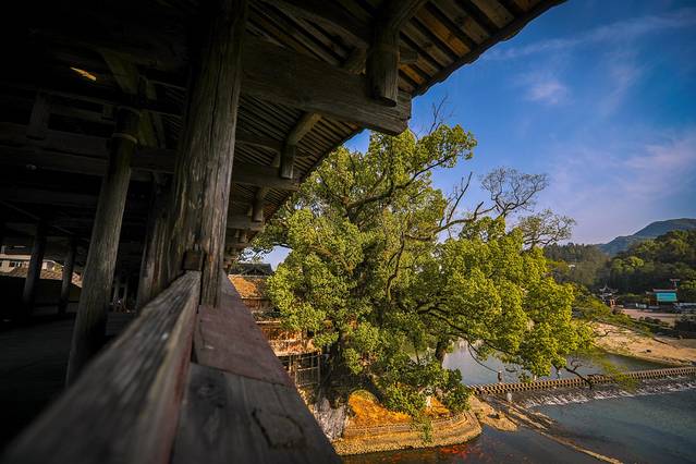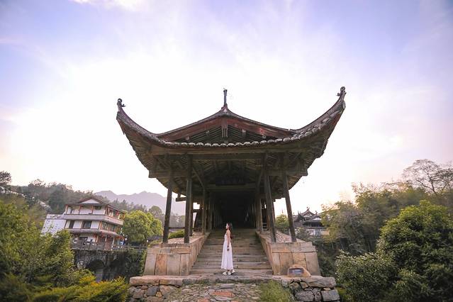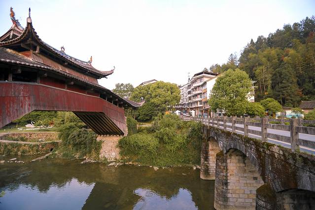 在街道的另一边又是一座历史悠久的廊桥,它与北涧桥合称泗溪姊妹桥,溪东桥初建于元至顺元年,廊桥基本层工艺由编木拱梁而成,外加髹红护板,侧望宛如曲虹,其映水影形酷似倒写‘八’字。