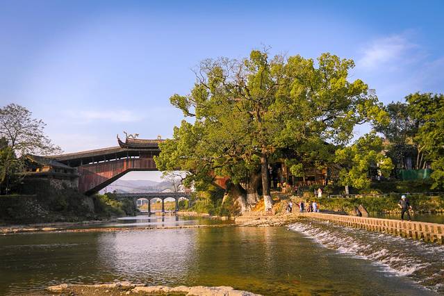 已经有三百多年历史的北涧桥,历史悠久,这座桥经过了好多次的洪水考验,桥头的古樟树,已经有1000年的历史了,下面那颗叫做乌桕树,也有600多年了,古桥、古树、古民居、古道路,古香古色凑合在一起,再加上青山绿水,这座廊桥被誉为“世界最美廊桥”。