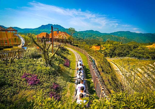 乘坐探险号小火车,由松垟花开至高点出发途径5个景点后返回到始发地,而且不限制年龄乘坐。