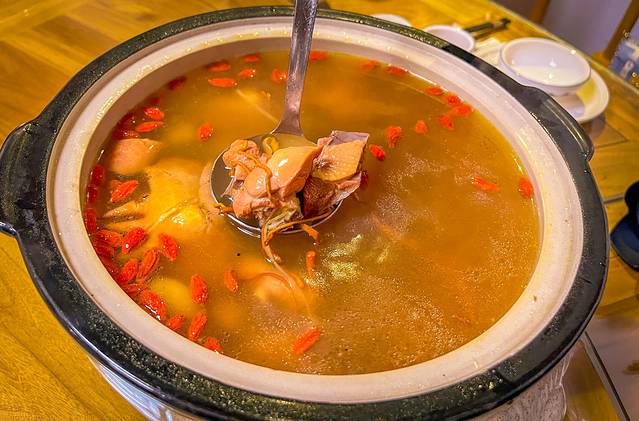 泰顺有氡泉泡汤养生,同样在美食上也很有讲究,“药食同源”的思想一直延续至今,在泰顺的几天,我们品尝到了美味的鸡汤,本地鸡加上虫草花,营养丰富而且味道鲜美
