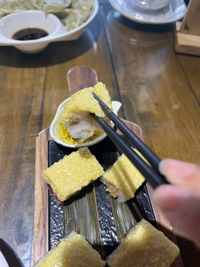 【沁州黄米凉糕】店在平遥古城有好多家,但洪武记饭店绝对是公认做的最好的。皮薄得剔透,可以看见里面包裹着一大颗的肉。非常弹韧饱满有嚼劲,多吃也都不会腻。