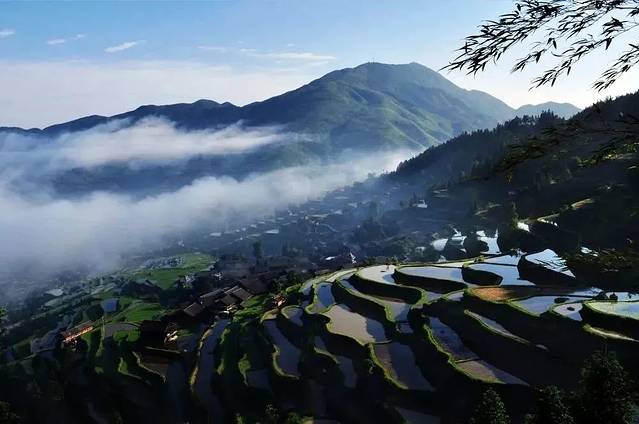 每至清晨,一层层云雾从河边缓缓升起,将梯田笼罩其中,吊脚楼在云雾中若隐若现,飘渺悠然,宛如仙境。