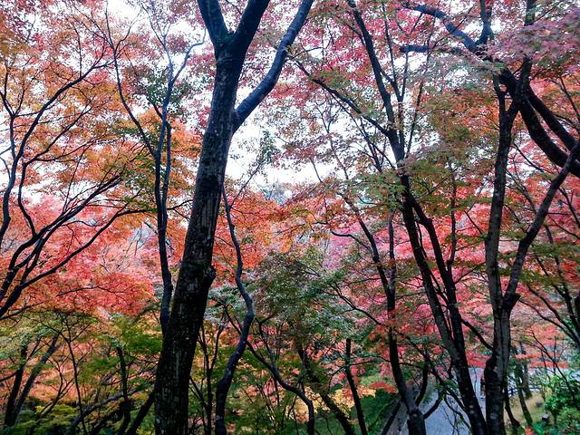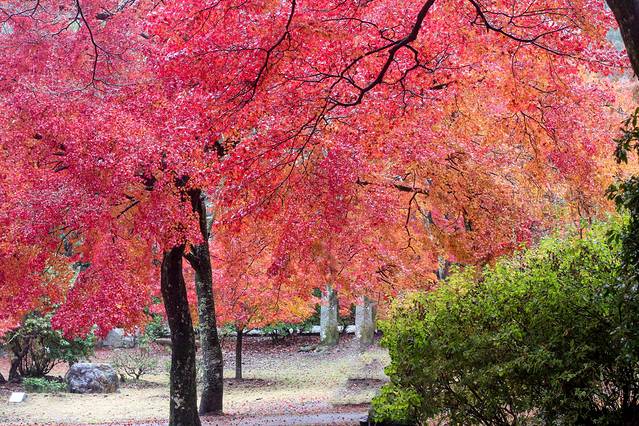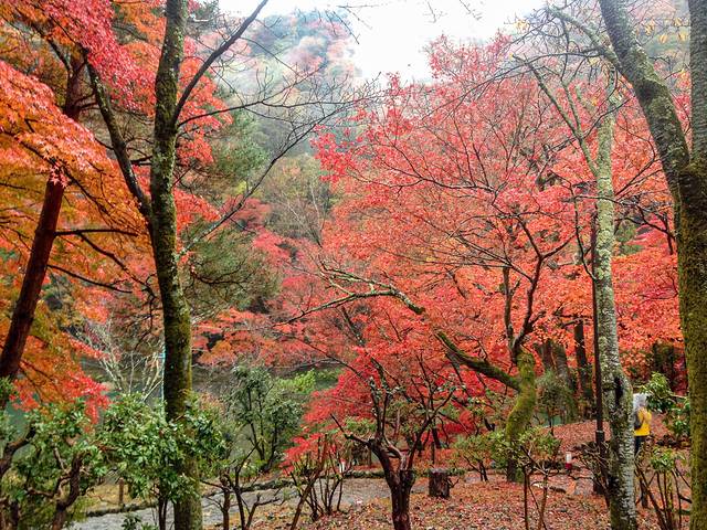 十一月的清晨,京都城西的岚山。车站旁河面烟雾缭绕,岚山上枫叶似火如橘,层层叠叠,色彩错落有致,在微雨中分外分明。沿河缓步登山,几丛冬果探首路边,晶莹的水珠挂在累累的果实上,愈发显得娇艳欲滴。深入山中,色彩从斑斓至橘红逐渐化为火红一色。昨夜风雨后,湿润的路面铺满枫叶,头顶树冠瀑布般倾泄而下,如同行走在画卷之中。