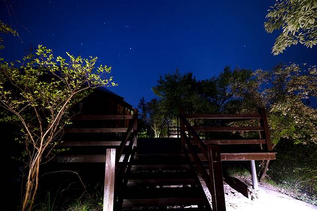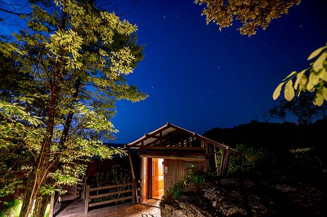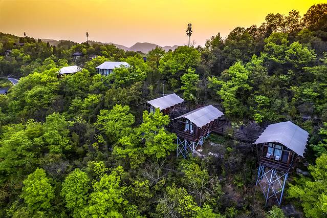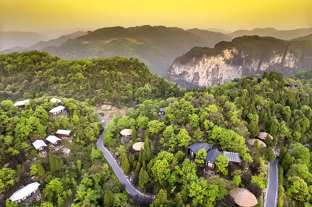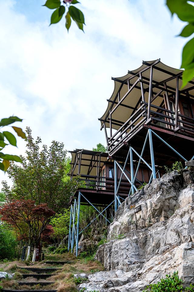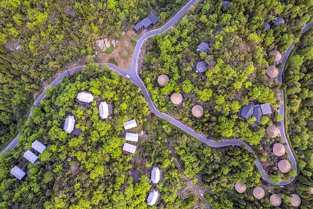 营地位于长江之滨、西陵峡畔的青山丛林之间,外部环境十分优秀,从高空俯瞰,一幢幢木屋像是森林中的蘑菇,恣意又可爱。