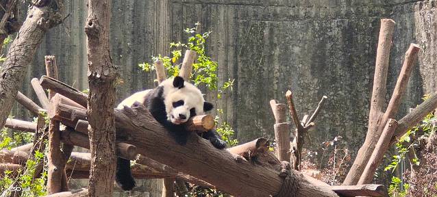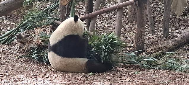 有的熊猫总是呆在宿舍里不出来,游客眼巴巴的等着出来,一旦有出来的,大家就围拢欢呼起来,工作人员(配戴着文明观赏引导员)就开始用喇叭提醒大家注意安全,不要让小孩子坐在围栏上。还有的熊猫很慵懒,背对着游客自顾自专心吃竹笋和竹子,吃饱后就开始各种姿态的呼呼大睡,根本不跟游客互动