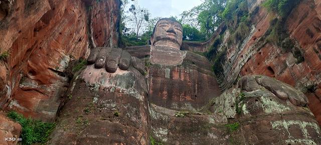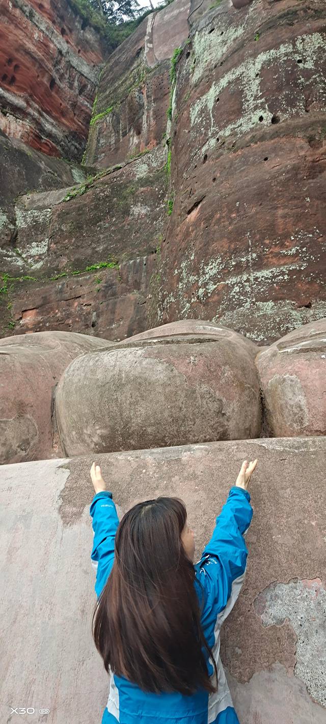 接下来到乐山大佛处,游人相对较多,由于要从山上走到最下边临江栈道,而且只容1或2人通过,造成游人聚集起来,排队缓慢才移步到大佛脚下。30多年前曾来此,那时游人还可以爬到大佛脚趾上,现在都禁止攀爬了。大佛耳朵处左右两边本来建有平台,游人可上山到达平台近距离观看,但今天两边向上台阶已拦住。不知是不是因为修建还是什么原因。