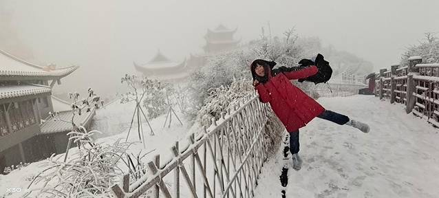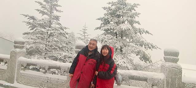 早上4点起来,半夜开始下的雨还没停,前一天看天气预报是晴天,看来看日出是没希望了。看这天气,一起上山的民宿游客争相购买民宿老板家的雨衣、雨鞋,摸黑冒着小雨一行人先徙步15分钟到达坐车地点,才发现我们是被安排到了旅行社的车上了。越往山顶开,山上竟然下起大雪。1个半小时后大约6点半多,到达乘坐索道处。此时天还没有大亮。索道(145元/人)下来后,山顶上已大雪覆盖,导游赶紧安排大家租大衣(35元/人)。这个红色大衣是不配白色的雪还挺好看?